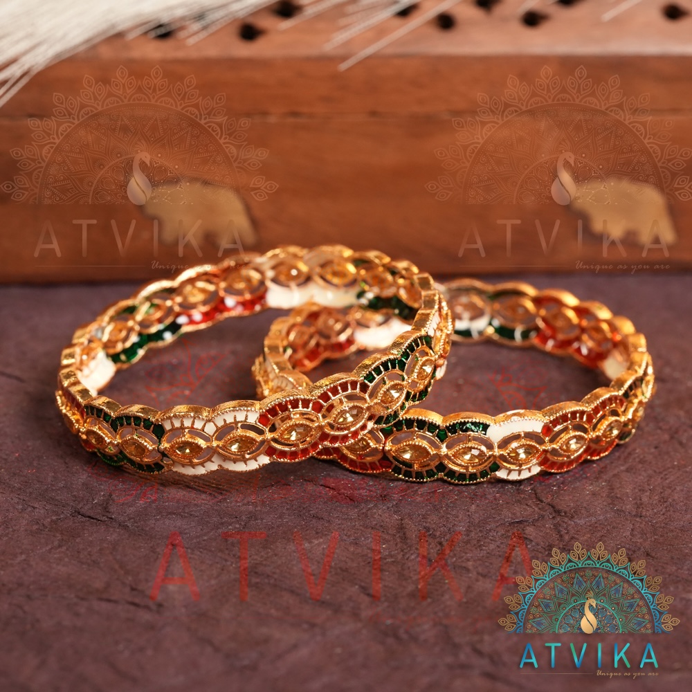 Brighten up your festive wardrobe with these vibrant multicolor meenakari bangles from Atvika. Crafted with intricate gold-tone cutwork and adorned with rich enamel accents in red, green, and white, these bangles exude a perfect blend of tradition and color. The symmetrical pattern and detailed craftsmanship make them ideal for weddings, religious ceremonies, and festive celebrations. Pair them with a silk saree, lehenga, or ethnic kurta to enhance your traditional look. Lightweight yet striking, these bangles add a graceful pop of color and charm to your jewelry collection, making them a timeless treasure for every occasion.