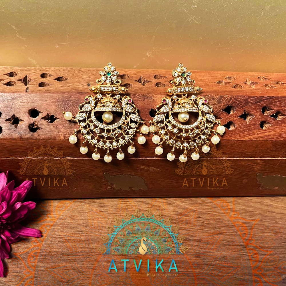 Add an ethereal charm to your festive wardrobe with Atvika’s Pearl Temple Chandbalis. Designed in an antique gold finish, these earrings showcase intricate temple-inspired motifs and dazzling white stones arranged in concentric patterns. The central pearl drop, surrounded by a circle of delicate mini pearls, brings a touch of divine grace. Accents of ruby and emerald stones at the top enhance the regal appeal. Perfect for weddings, festive occasions, or traditional gatherings, these chandbalis are a timeless statement of elegance and heritage.