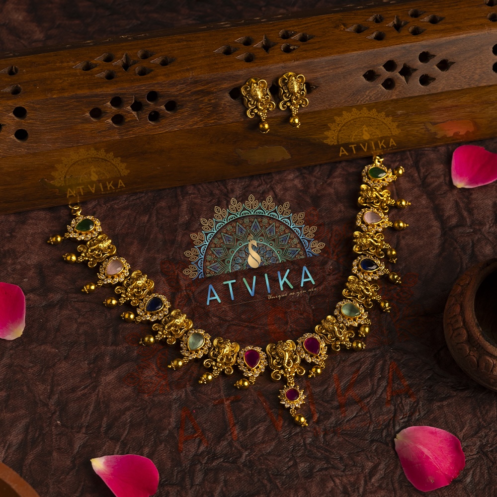 Temple Jewellery Set with Multicolor Stones and Matching Earrings is a beautiful blend of divine artistry and vibrant elegance. The necklace features intricate designs of Lord Ganesh, meticulously crafted to bring out the rich cultural heritage and spiritual symbolism of the piece. Alternating with the Ganesh motifs are large, multicolored stone motifs, each studded with shimmering white stones that add a striking contrast and enhance the necklace’s visual appeal. The stones are set in an elaborate pattern, giving the necklace a dynamic and eye-catching look. Hanging golden pearls at the bottom add a touch of grace and movement, elevating the overall design. The matching earrings complement the necklace perfectly, echoing the same intricate detailing and multicolored stones.