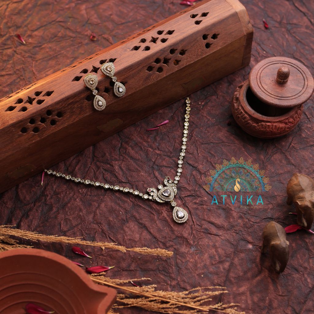 Add subtle sparkle to any look with the Atvika White Teardrop AD Necklace & Earring Set. This elegant design features a delicate chain of shimmering white AD stones leading to a graceful double teardrop pendant, perfectly matched with dainty drop earrings. Lightweight and comfortable, it’s ideal for long events without feeling heavy on the neck or ears. The neutral white stones pair beautifully with sarees, lehengas, gowns or even simple kurtis, making it a versatile must-have in your jewellery box. Perfect for receptions, engagements, festive dinners or party nights.