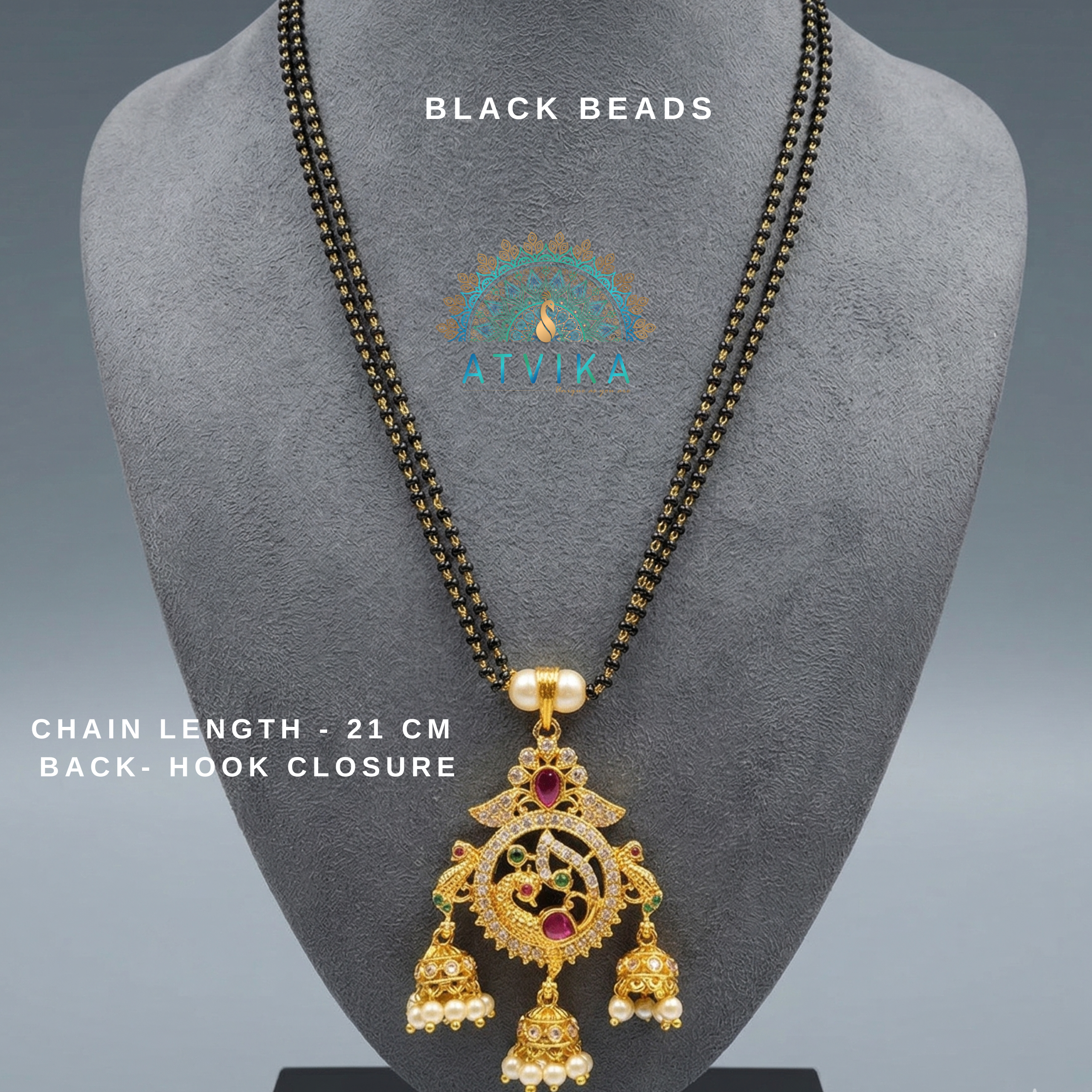 A beautifully designed black beads chain featuring an elegant stone-studded pendant accented with rich deep pink, green, and white stones. Finished with graceful pearl jhumki drops, this traditional piece brings a perfect blend of classic charm and festive elegance, making it ideal for weddings, poojas, festive wear, and cultural occasions.