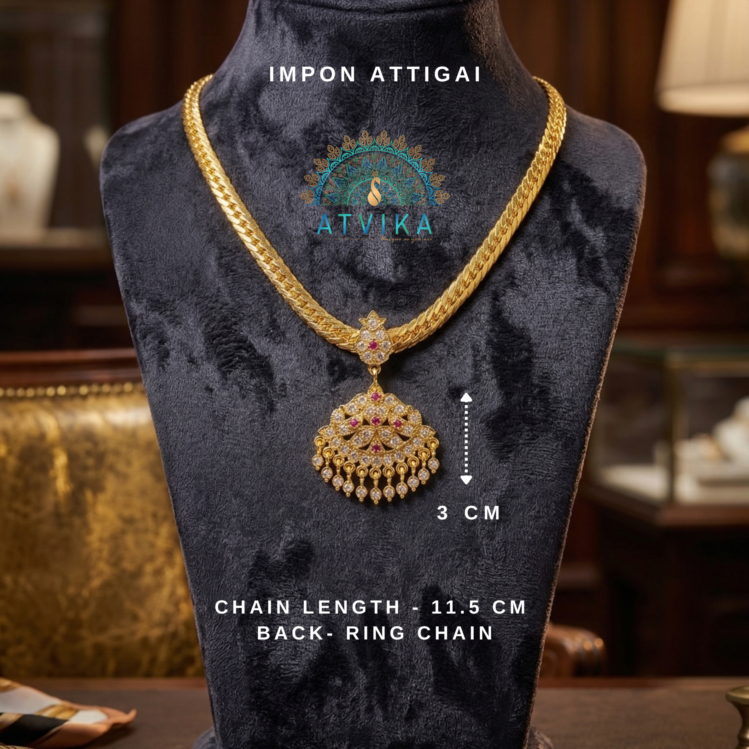 Impon Attigai is a traditional short necklace known for its rich gold-like finish and elegant heritage appeal. Its unique beauty lies in the close-neck design, detailed craftsmanship, and timeless festive look, making it perfect for weddings, poojas, and traditional wear without the weight of real gold.