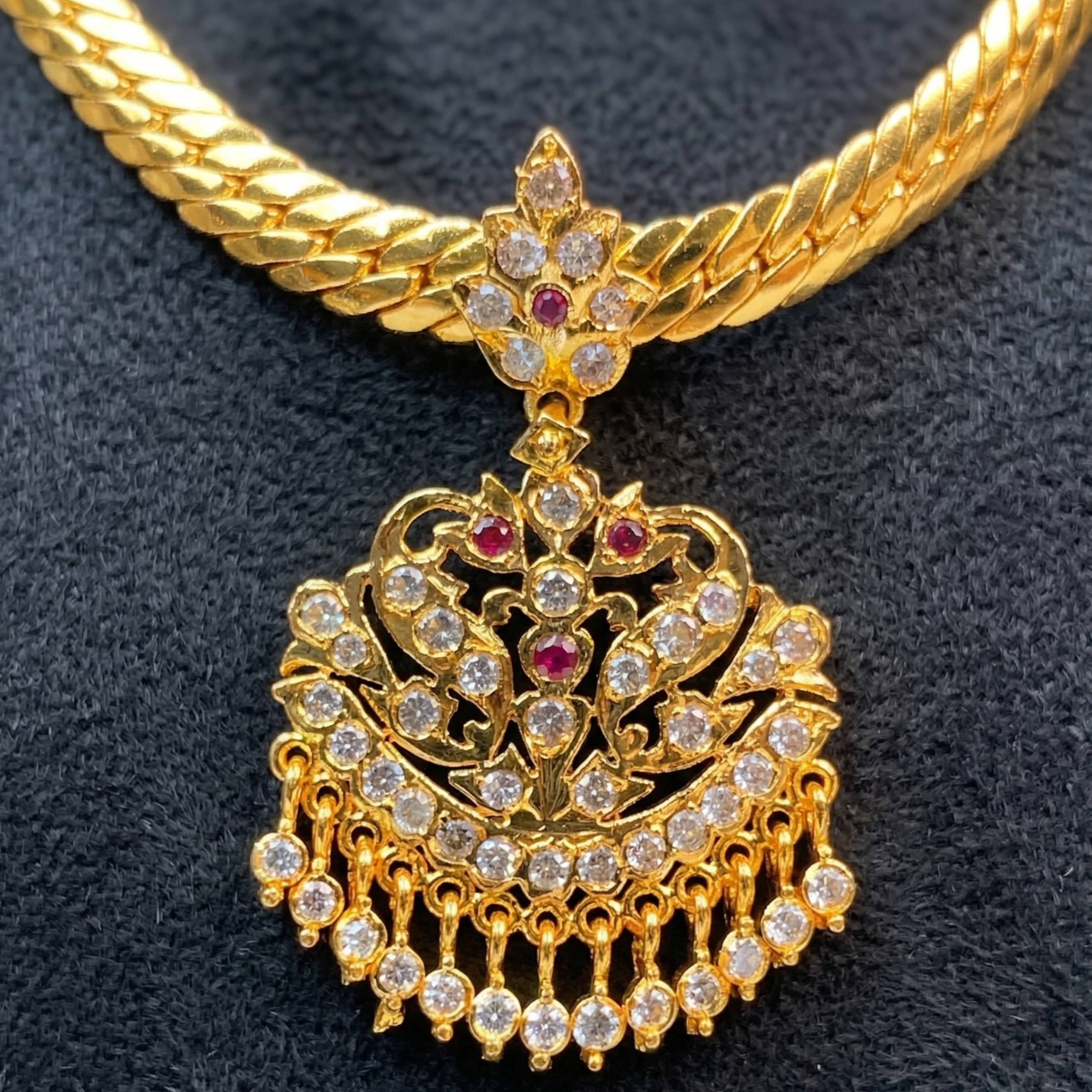 A graceful Annam Impon Attigai featuring a rich traditional gold-tone chain with a beautifully crafted annam-inspired pendant, highlighted by sparkling white stones and elegant red stone accents. With its classic heritage charm and timeless festive appeal, this stunning piece is perfect for weddings, poojas, family functions, and traditional occasions.